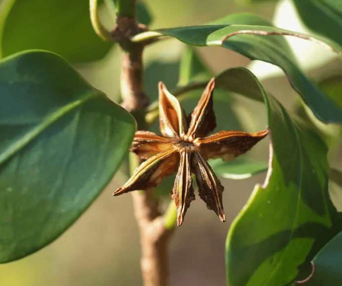 Ботаническое описание. Бадьян настоящий (анис звездчатый) Illicum verum - дерево высотой 6-10 м. Ствол прямостоячий. Ветви хрупкие, легко ломающиеся. Листья очередные, большей частью собраны по 3-5 на концах ветвей. Пластинка листа эллиптическая, оттянутая к основанию, кожистая, сверху блестящая, снизу тусклая. Цветки розоватые, одиночные, пазушные, с 15-20 лепестками. Плод сложный, обычно из 8 листовок, расположенных звездой. Каждая листовка содержит семя, гладкое, блестящее, светло-коричневое. Цветет в апреле - мае. Плодоносит в июле - сентябре. Растет в Средней и Южной Азии. Разводится как декоративное растение.[