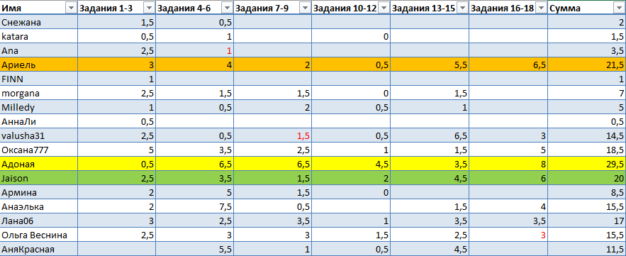 Подсчитал итоги конкурса. Получилось, что больше всего баллов получила Адоная, на втором месте Ариель, а на третьем Jaison.