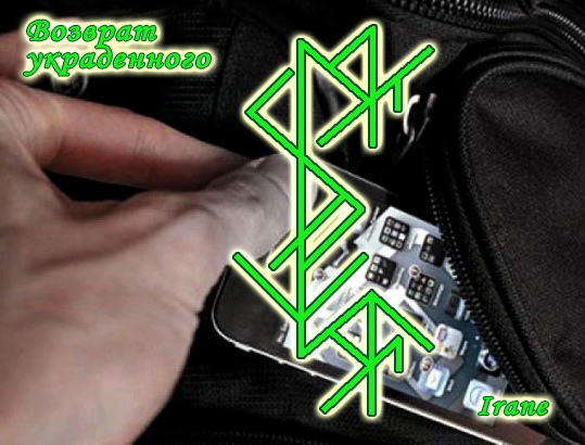 Тейваз (пер.) + Наутиз + 2 Райдо (зерк.) + 2 Лагуз - сломить волю и нежелание вора вернуть украденное, и заставить его вернуть, скрывая свое воздействие мороком.