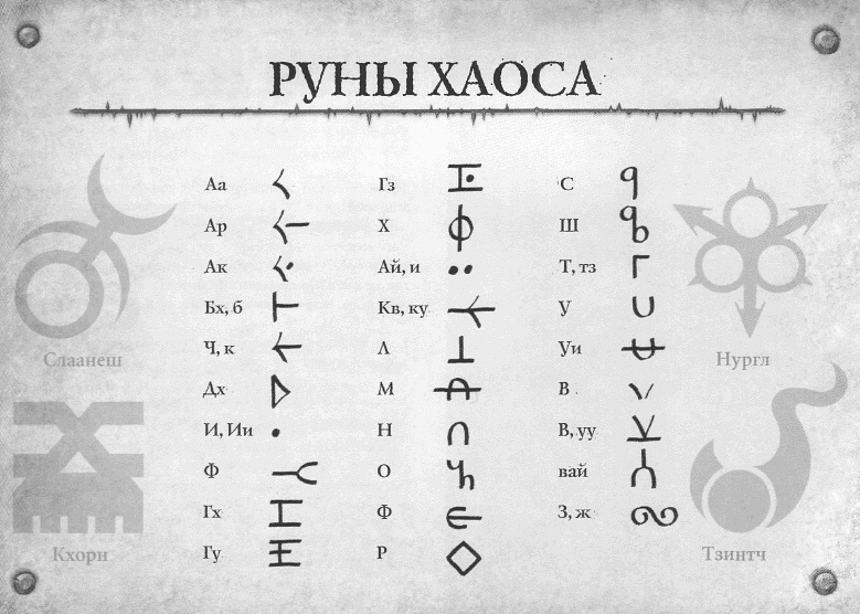 Тёмное наречие записывается в форме череды фонетических рун, каждый символ которых обозначает произносимый звук. Тёмное наречие в своей письменной форме обладает гораздо меньшей силой, чем произносимые слова, отсюда обычай многих колдунов записывать свои заклятия в тома и гримуары. И лишь когда эти слова произносятся громко, они вновь обретают былую силу и размах. Это также затрудняет перевод, поскольку все колдуны используют разные руны для обозначения произношения слов – попытка прочитать записи другого волшебника с ошибками в произношении в ритуале или заклятии обычно ведет к ужасным, последствиям. Руны Хаоса дрожат от собственной силы, долгое наблюдение за ними может вызвать головную боль, тошноту . Поэтому на многих знамёнах Хаоса нанесены эти руны – чтобы пугать и сбивать с толку врагов