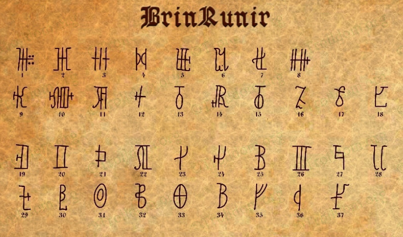 Brin runir – руны Брина. Брин – это фамилия. А еще перевод слова «brin» с французского языка – «нить». Итого мы имеем алфавит ниток и узлов. Очень неплохо вышивать необходимые символы как обережную вышивку на шторы, к примеру, или обивку мебели.