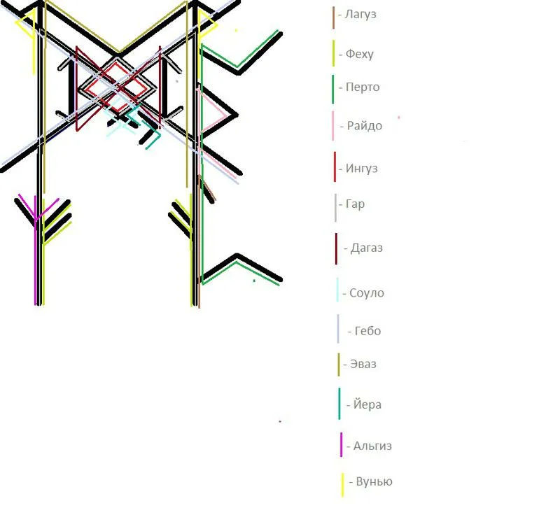 Гар+Дагаз+Гебо+Ингуз - изменение стечения обстоятельств в нашу пользу, достижение поставленной цели, удача, выигрыш, подарок, находка, халявные деньги, быстрое получение денег (результата)
