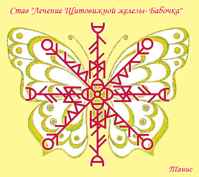 Данный рунический став (ДРС) с комфортом для «...» лечит щитовидную железу. Снимает биомутации нанесенные «...» временем и негативом, и восстанавливает здоровые функции щитовидной железы, а также став даёт силу «...» на то, чтобы справится с болезнью, восстанавливает здоровый сон, а также восстанавливает иммунную систему организма и психологическую уравновешенность.