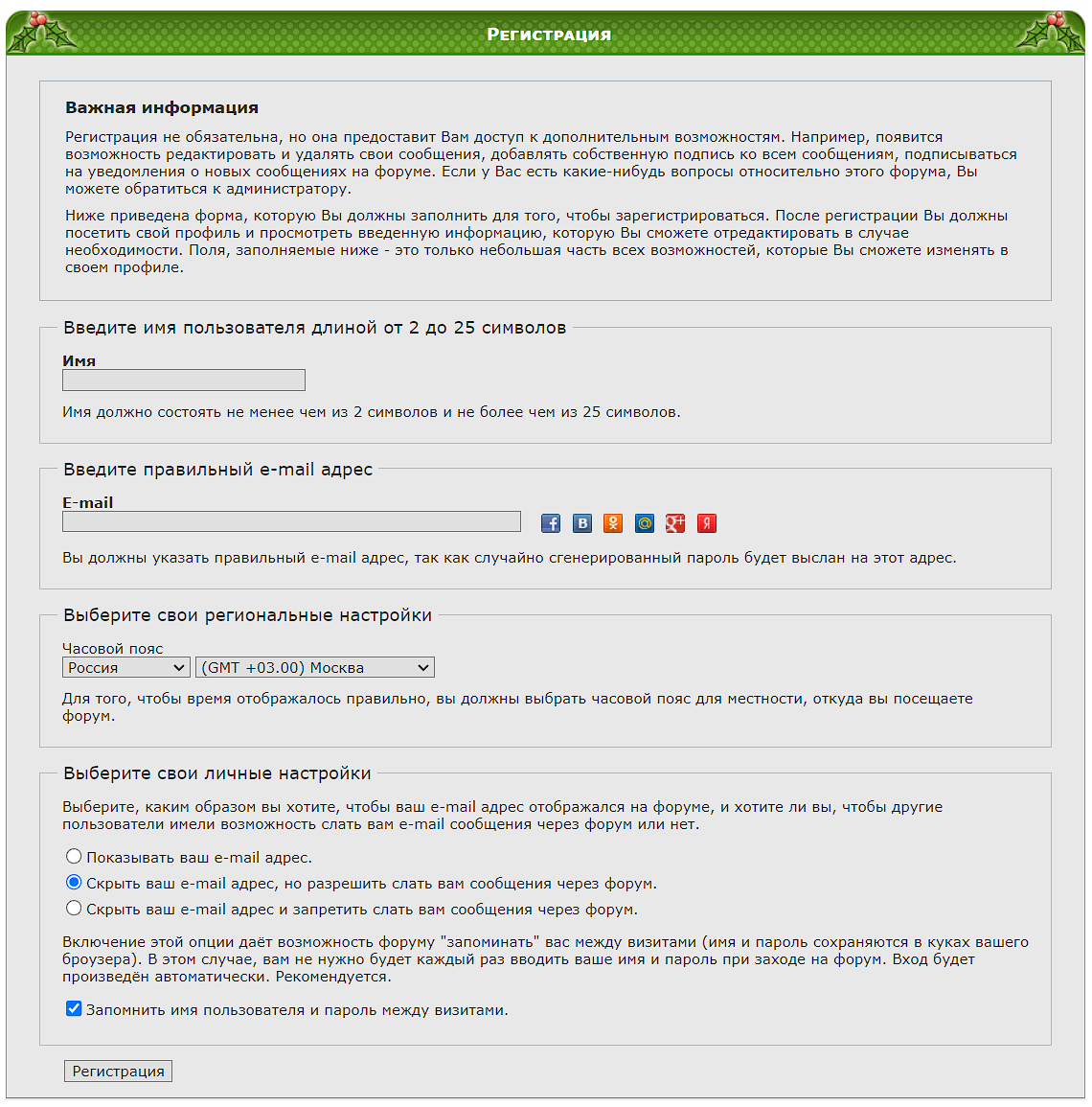 Мы рекомендуем вам выбирать второй вариант, где другие пользователи смогут отправлять Вам письма на ваш электронный адрес.После введения всех данных, перепроверьте их на правильность и после нажмите на кнопку «Регистрация». Если вы сделали все правильно, на ваш E-mail придет письмо с вашим Именем пользователя, Паролем и Ссылкой для подтверждения регистрации на форуме. Не забудьте активировать свой аккаунт!