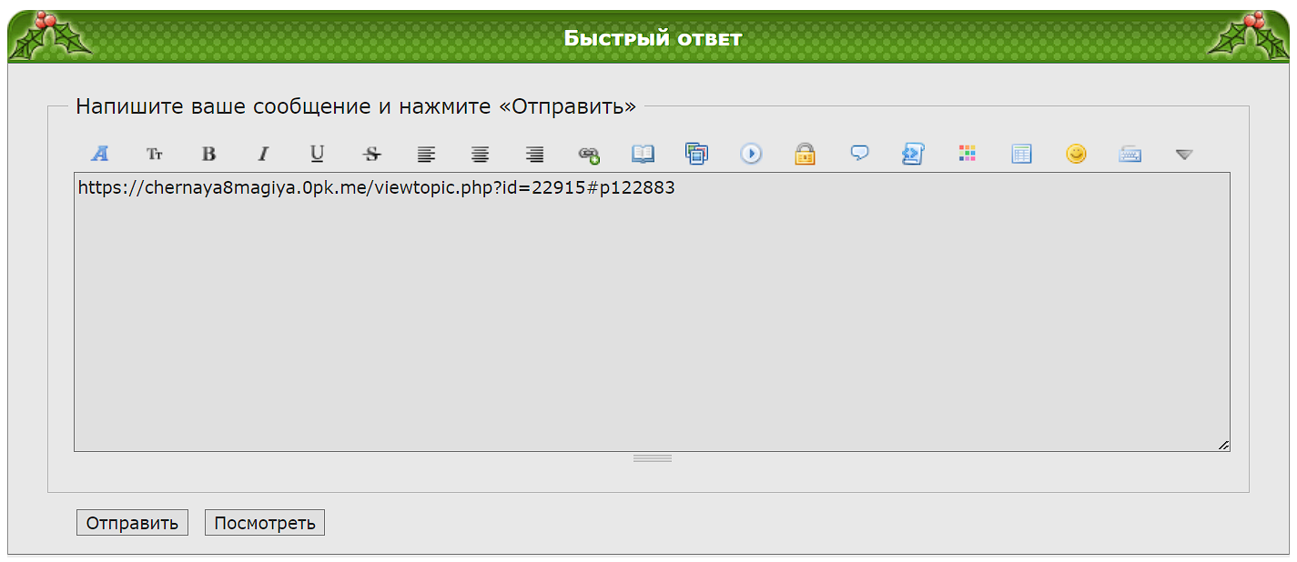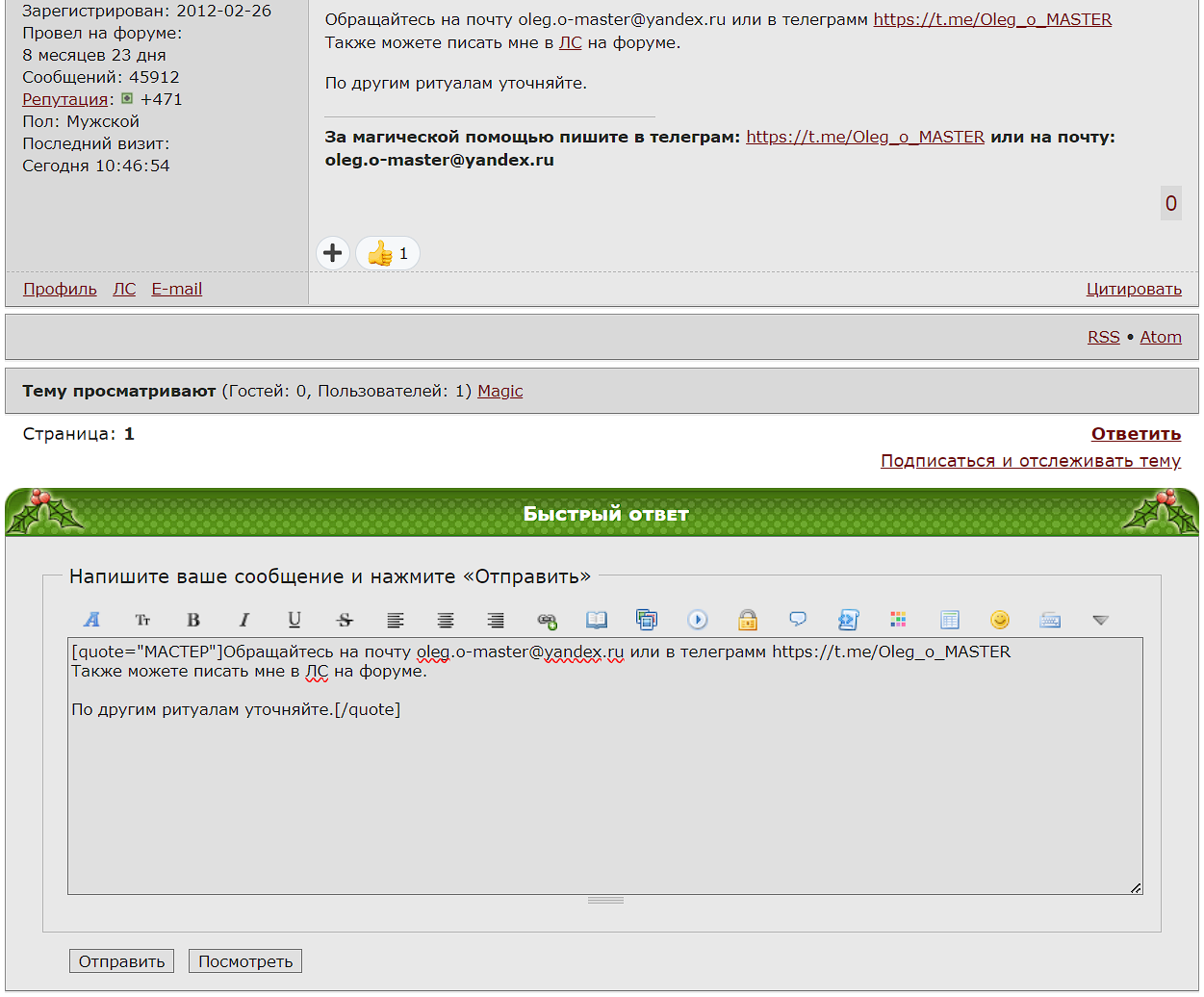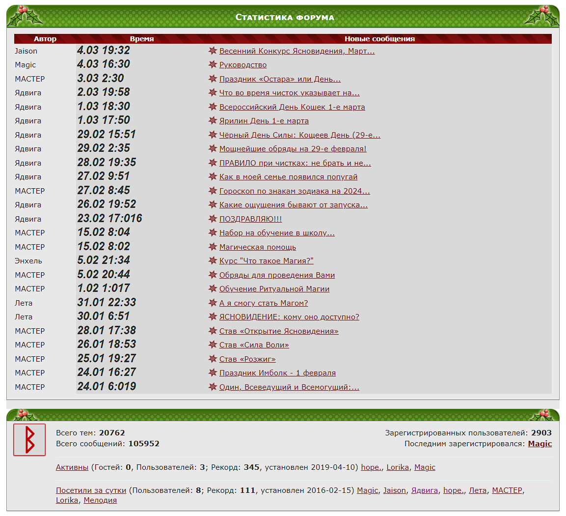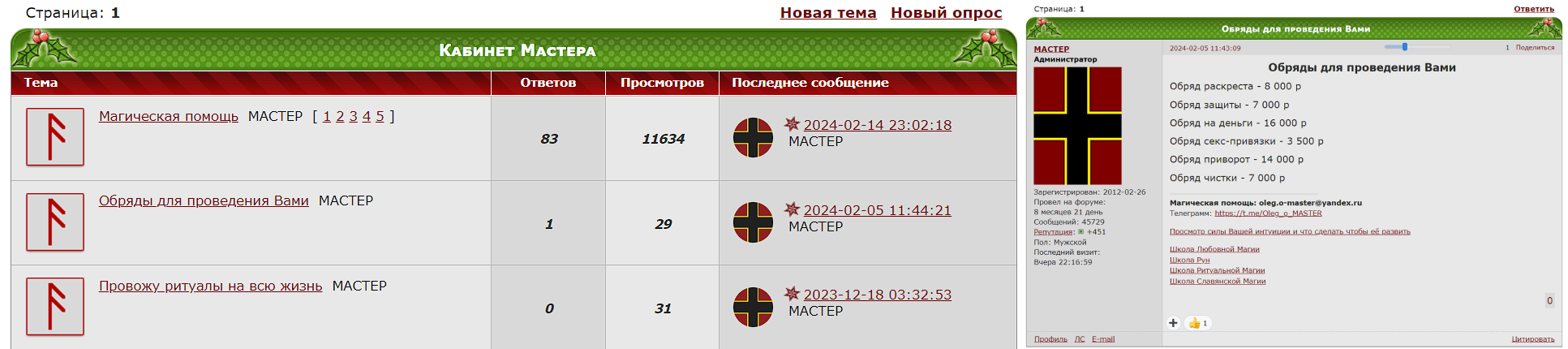 На главной странице: https://chernaya8magiya.0pk.me/ расположена вся структура форума, которую вы видите после входа в ваш аккаунт. Она включает в себя: категории, разделы, темы и сообщения пользователей.