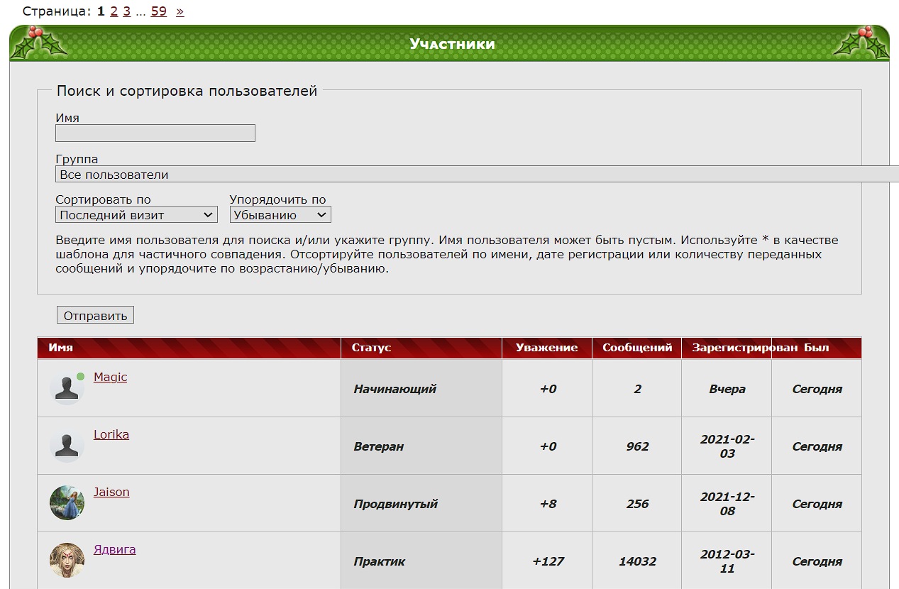 Чтобы увидеть весь список пользователей Вам нужно нажать вверху шапки на пункт «УЧАСТНИКИ», или перейти по активной ссылке: https://chernaya8magiya.0pk.me/userlist.php (фото).