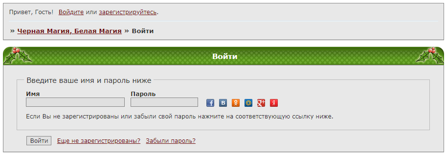 Для входа в свой аккаунт вам нужно нажать на кнопку «ВОЙТИ» в правом верхнем углу шапки (фото) или перейти по ссылке: https://chernaya8magiya.0pk.me/login.php