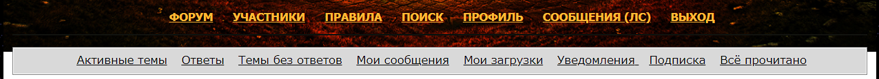 В самом верхнем углу расположена шапка, в которой находится основное меню, включающее в себя важные и ключевые пункты навигации: «ФОРУМ», «УЧАСТНИКИ», «ПРАВИЛА», «ПОИСК», «ПРОФИЛЬ», «СООБЩЕНИЯ (ЛС)», «ВЫХОД».