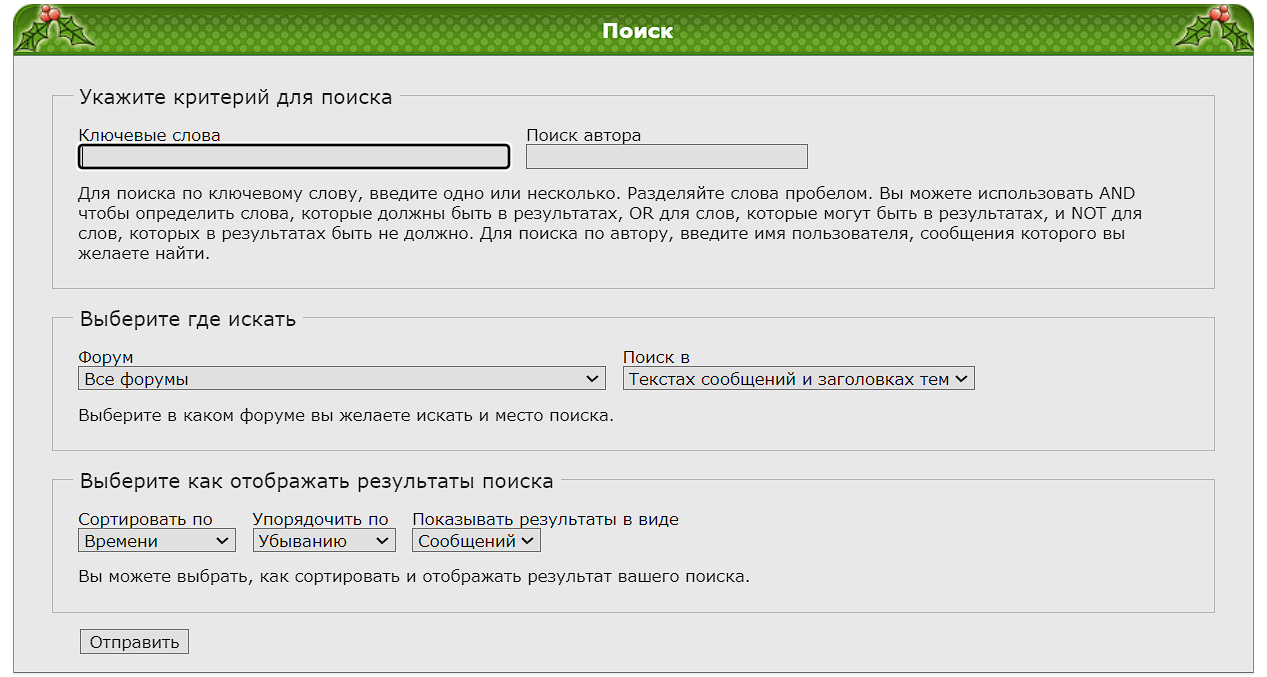 1. Ключевые слова, которые отражают Ваш запрос, и по которым будет происходить поиск тем и/или сообщений. Дополнительно вы можете ввести Имя пользователя, и весь дальнейший поиск будет связан с этим автором.