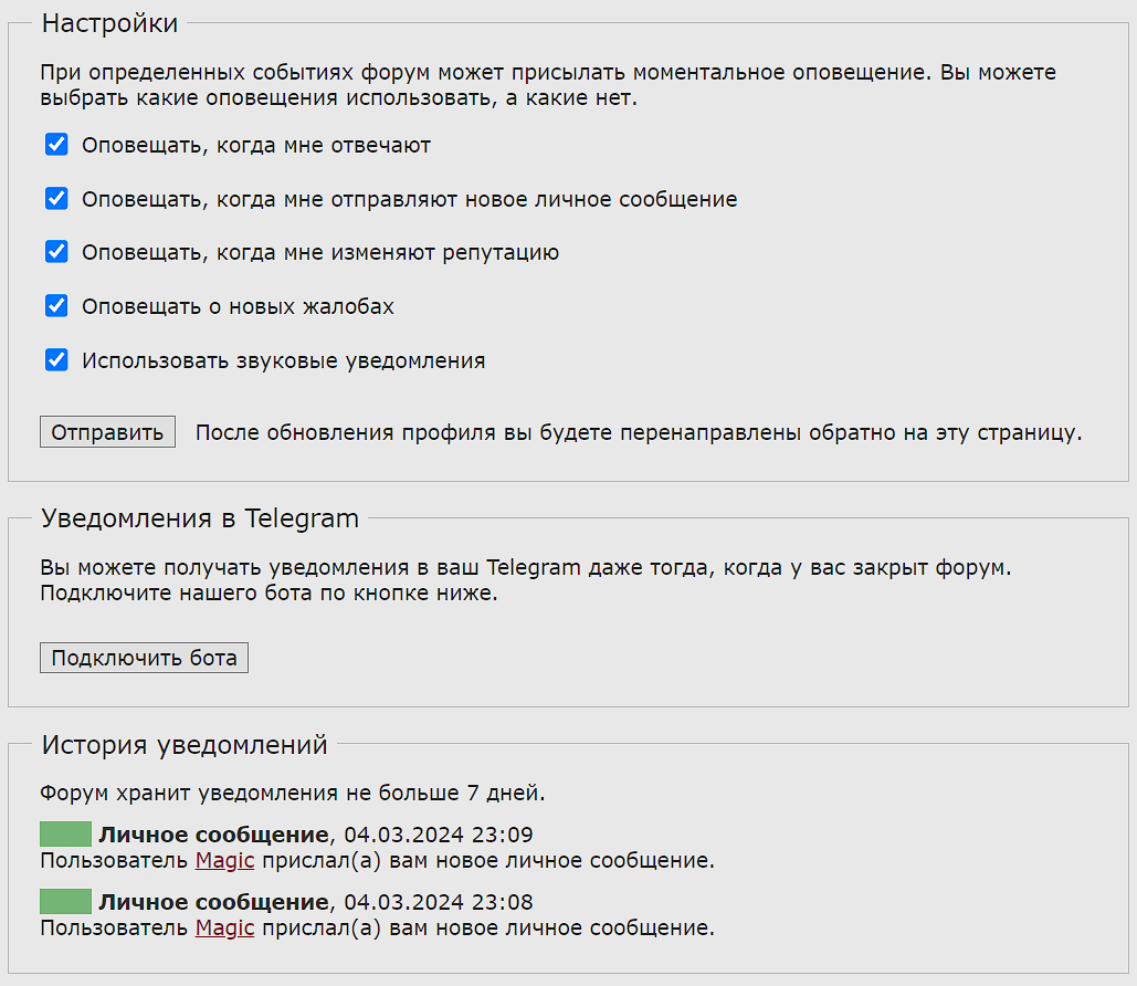 Если у вас нет новых уведомлений, то при нажатии на пункт в меню Вы попадете на страницу своего профиля, во вкладку настройки уведомлений. Вы можете настроить уведомления, подключить уведомления в Telegram или просмотреть их историю (фото).