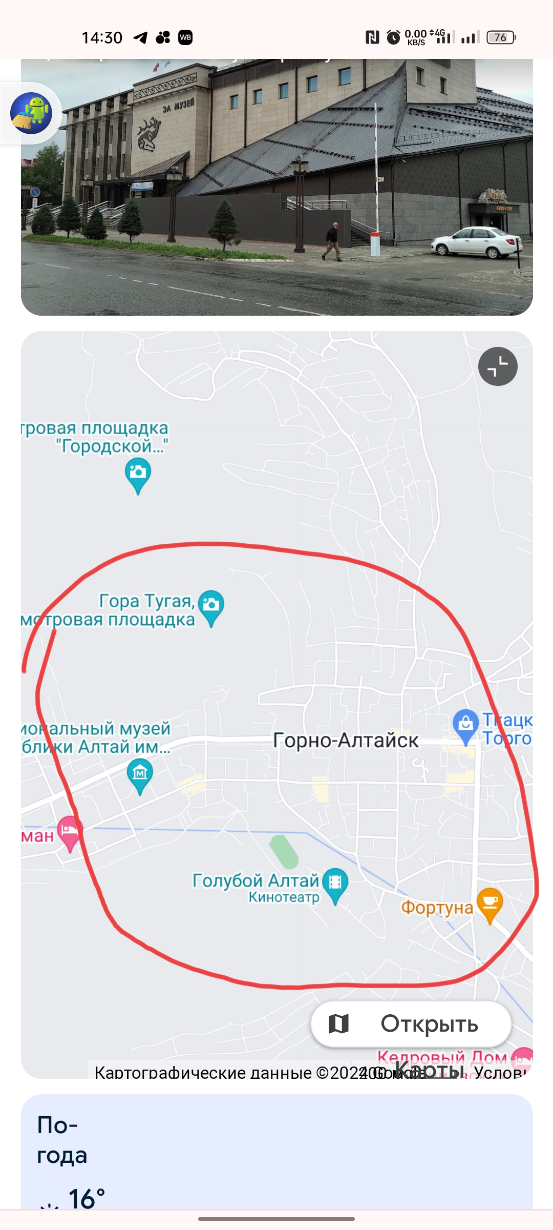 По второй части задания, идет, что был съезд влево не доезжая Горно-Алтайска. Маршрут место тихое безлюдное, уединенное и на машине к нему прямо неподъехать, машина осталась в метрах пятистах. Тишина, лес. И потом далее человек направился в Горно-Алтайск. Идет, как въезжаешь, уходишь куда то правее, если смотреть в целом на карту. Куда-то, где есть обзор. Потом, идёт, что вы направляетесь в кафе на перекус, район на карте от Додо до администрации. И дальше на заправку, где-то с выезда из города.