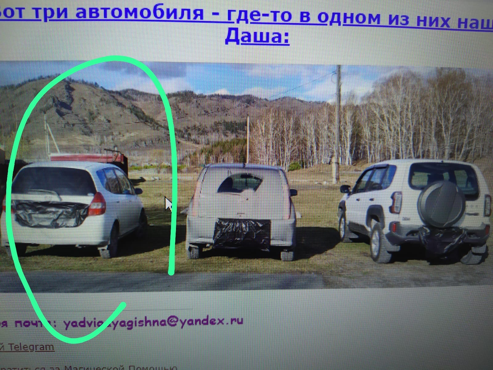 Как это будет выглядеть: сначала Я выложу фото всех машин, в одной из них будете сидеть человек, остальные будут стоять пустые. Надо будет найти машину с человеком, любая информация сверх - даёт дополнительные баллы.