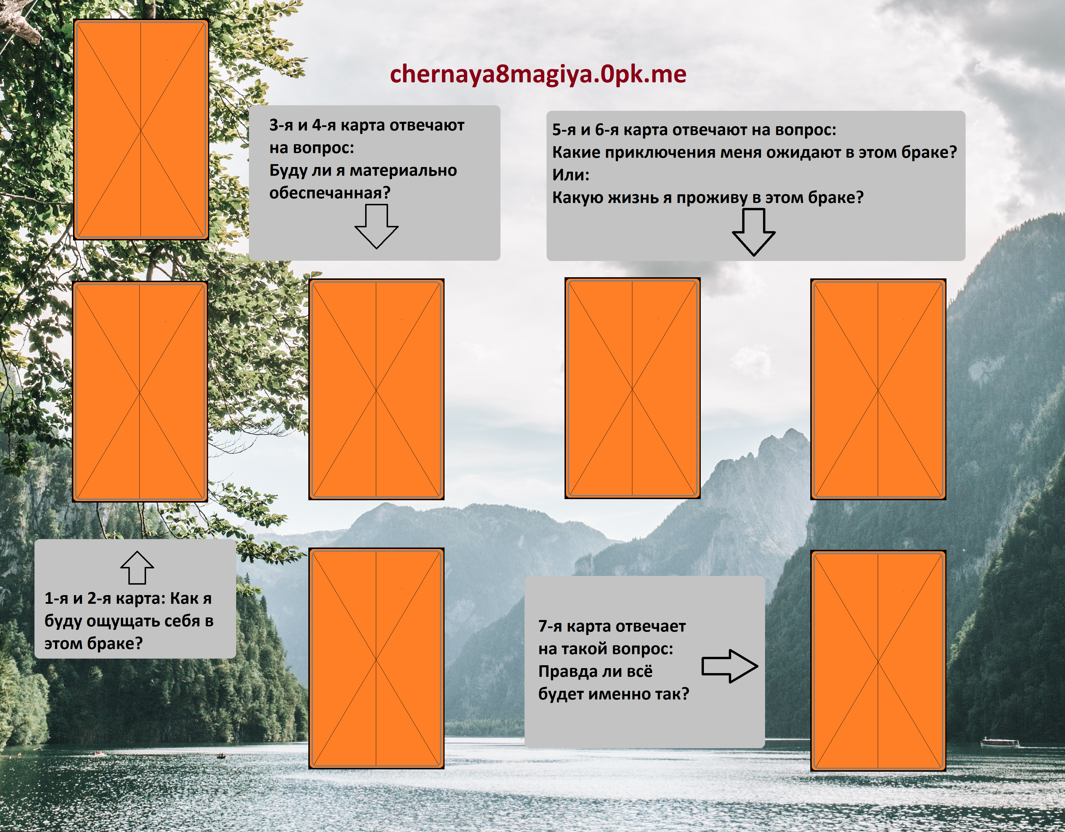 В раскладе всего 7 карт. Этот расклад даёт понять как будут развиваться события, какие перспективы, если Вы вступите в брак с конкретным мужчиной.