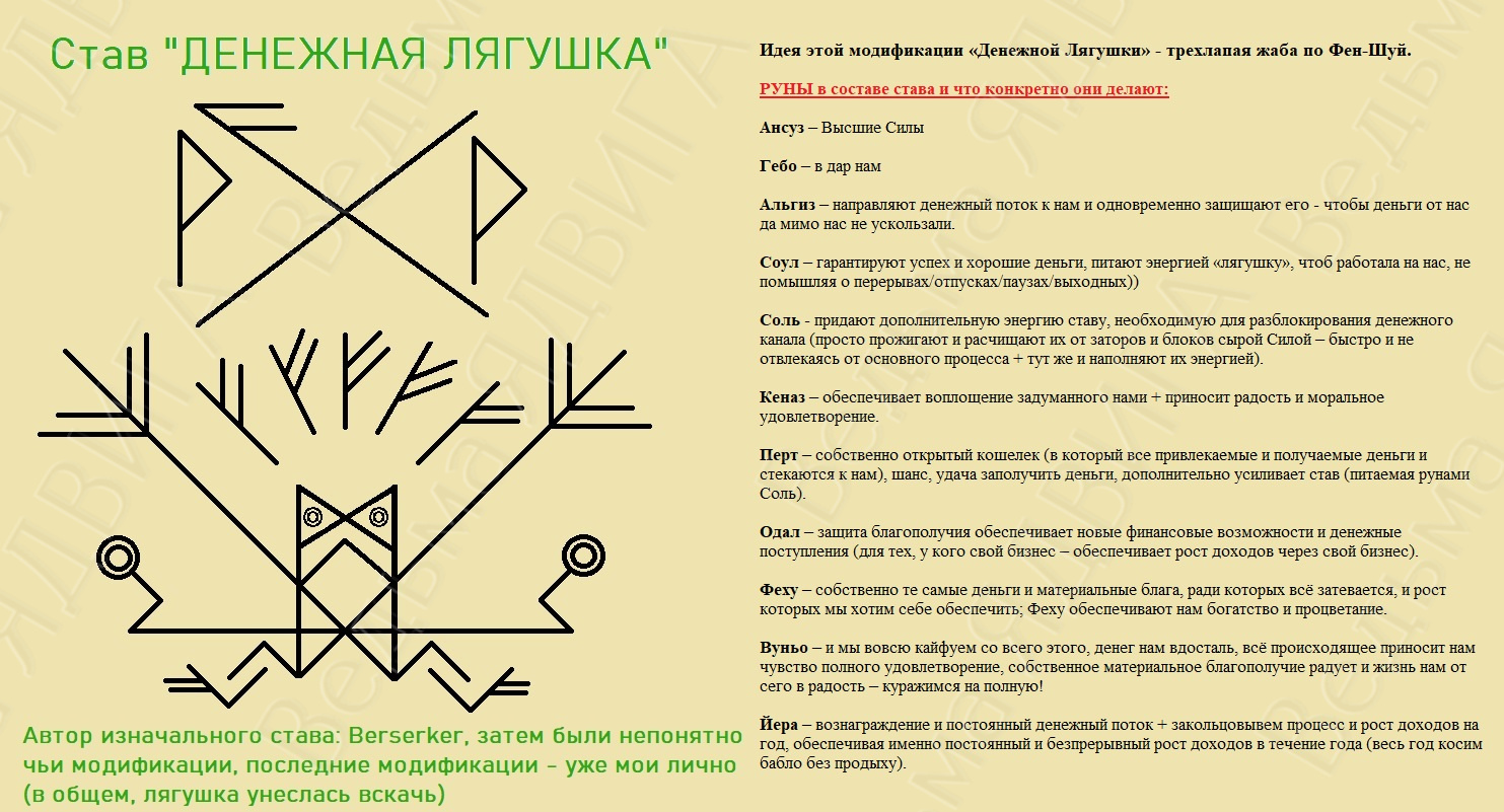 ✅Далее я так и не нашла концов, кто этот став модифицировал и привёл к вот такому виду: Став ДЕНЕЖНАЯ ЛЯГУШКА (тут тоже были вопросы: на картинке появились новые руны, а в описании к ставу о них ни слова - там всё до последней буквы суть описание изначального автора)