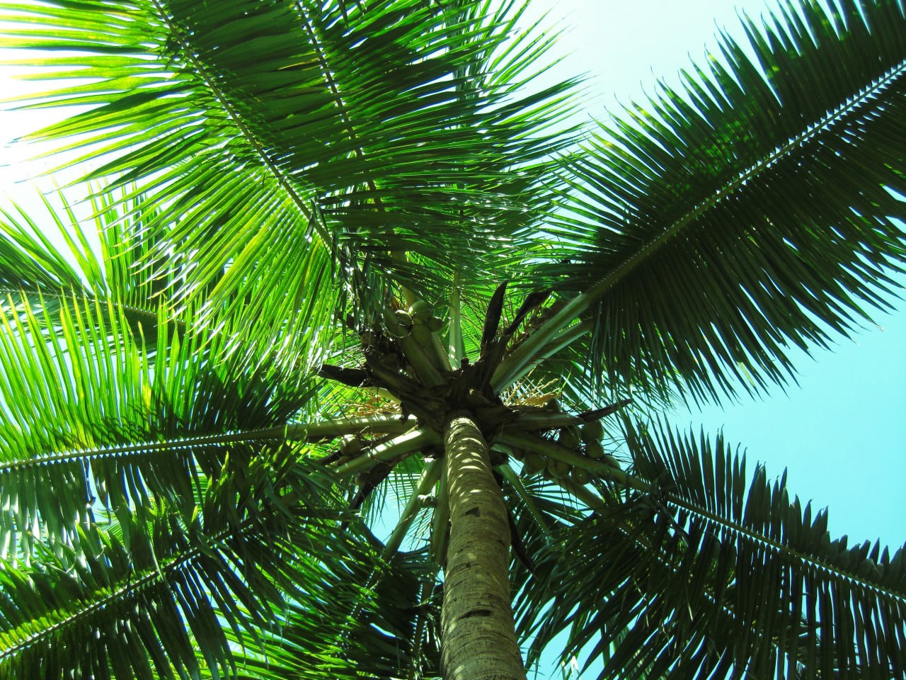 1) В каком месте на пальме тогда висело больше всего кокосов?