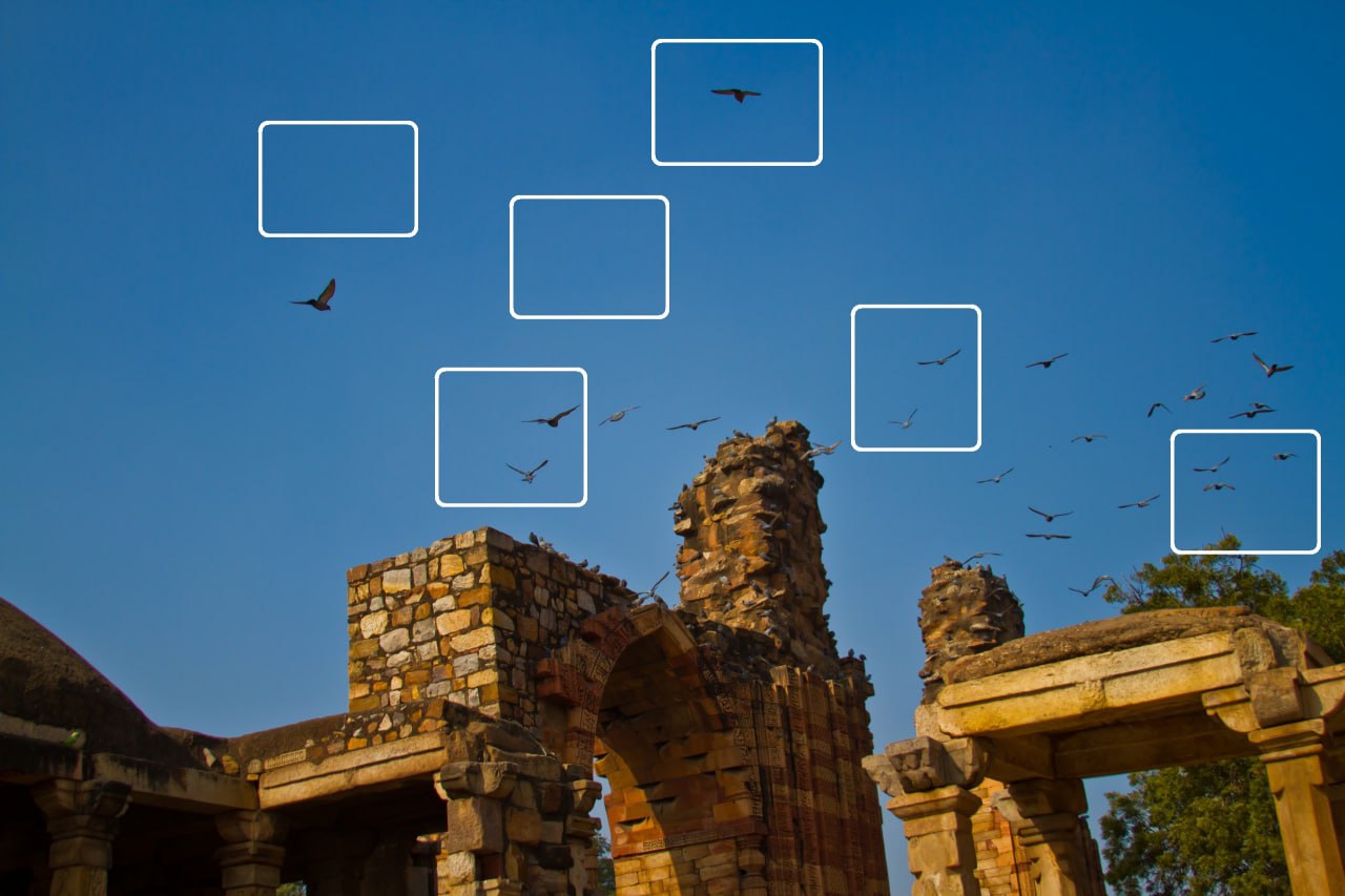 На фото летают птицы. Некоторые места закрашены.