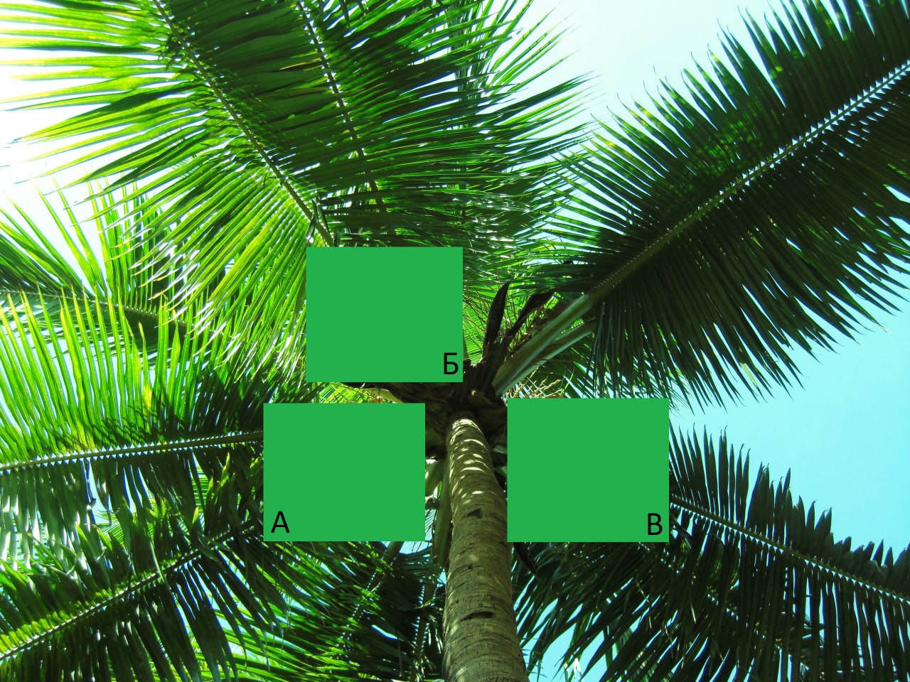 1) На пальме больше всего кокосов висело в месте "В", где было аж 9 кокосов.