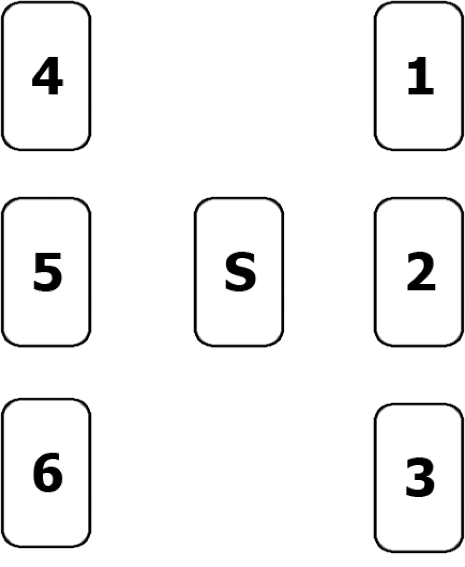 После выбора такой карты и проведения предварительных процедур клиент выбирает шесть карт, которые мы раскладываем согласно схеме.