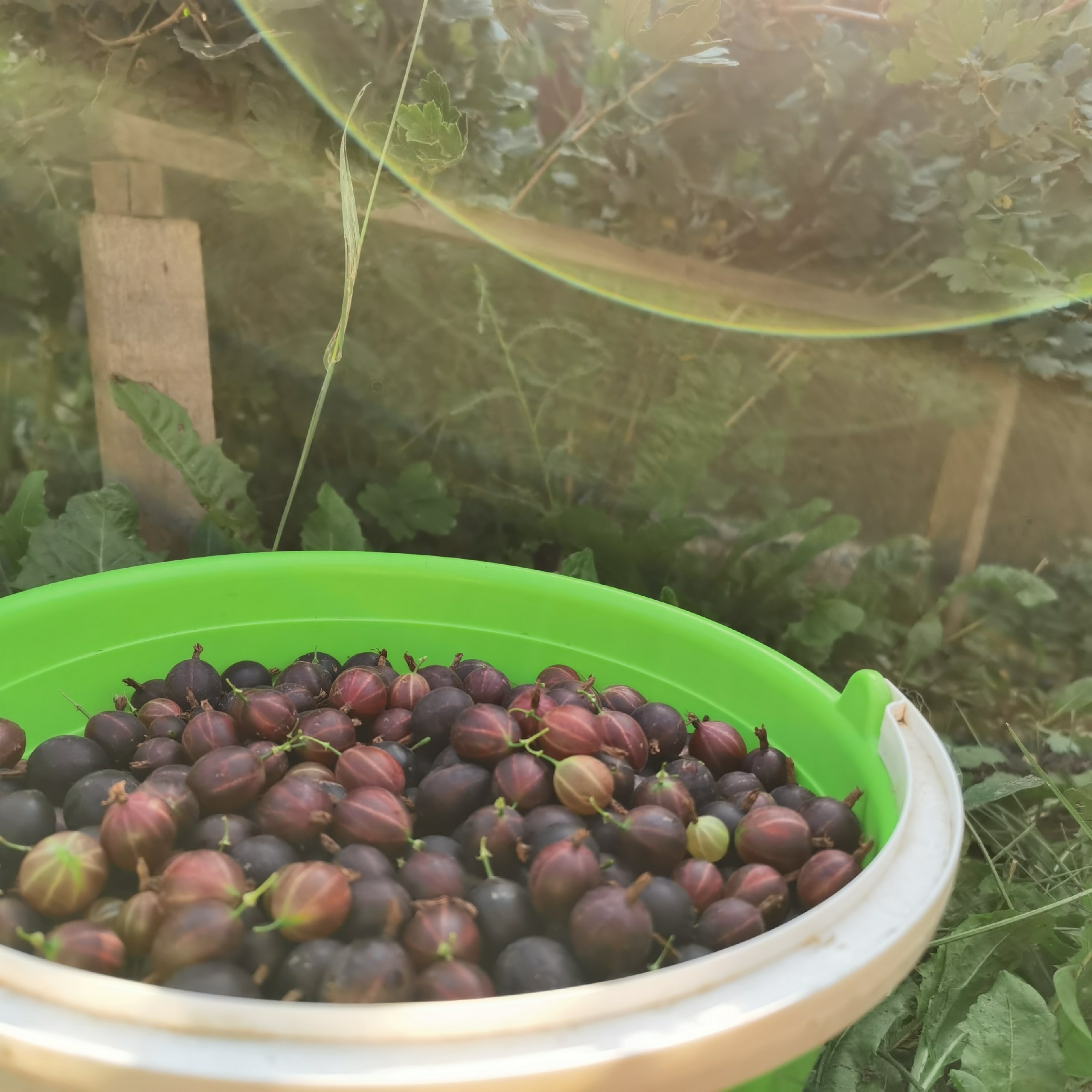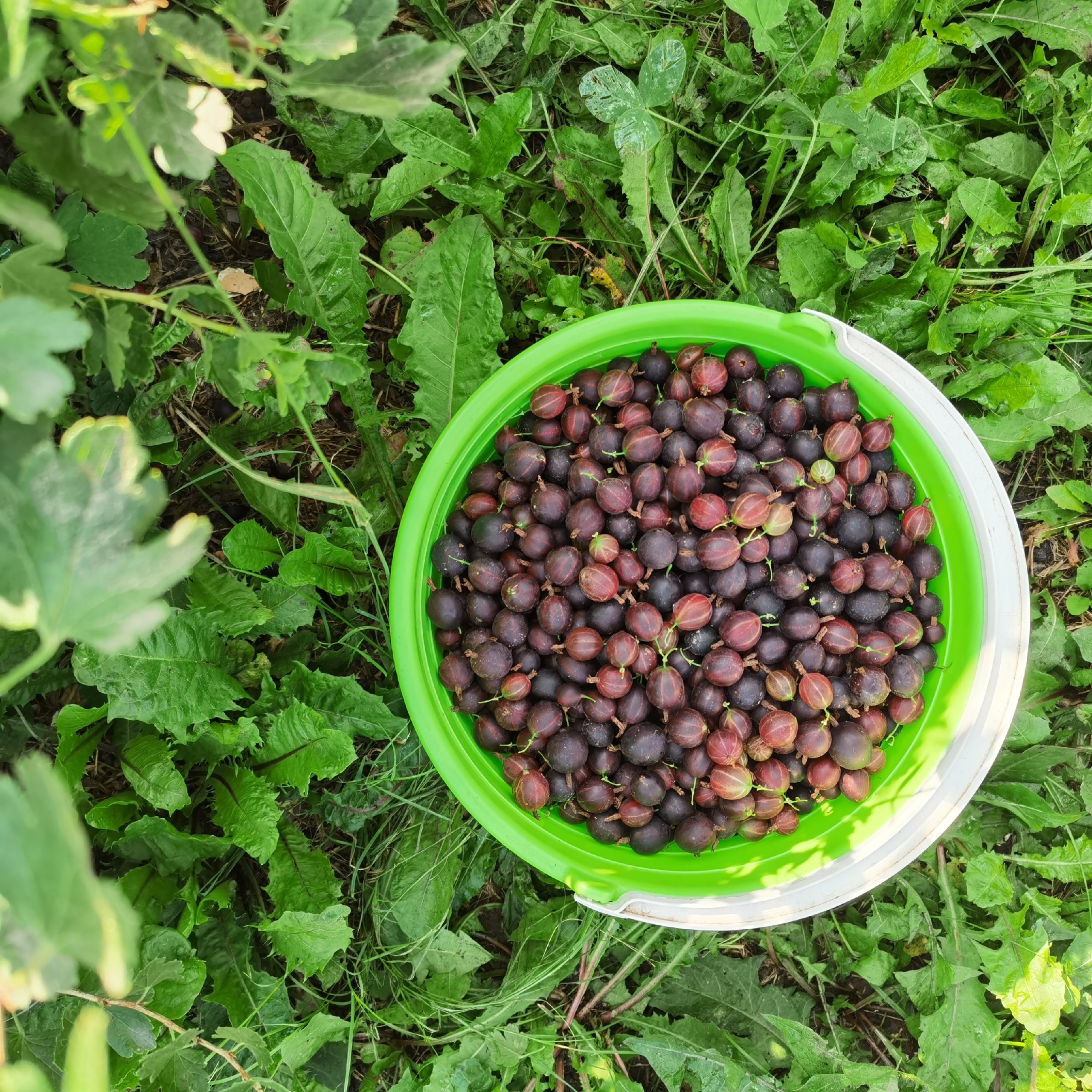 1) Идёт, что в ведре были мелкие ягоды, у них есть сухой хвостик на конце, цвет такой тёмный ближе к бардовому. Предположу, что там крыжовник.
