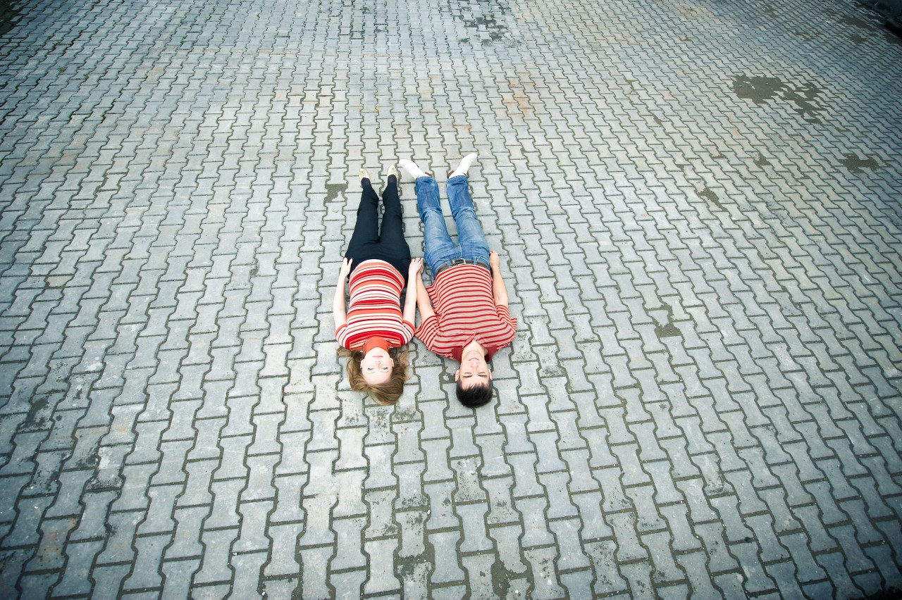Двое лежали прямо по центру, Две девушки, полосатая футболка у правой, держались за руки правыми руками.