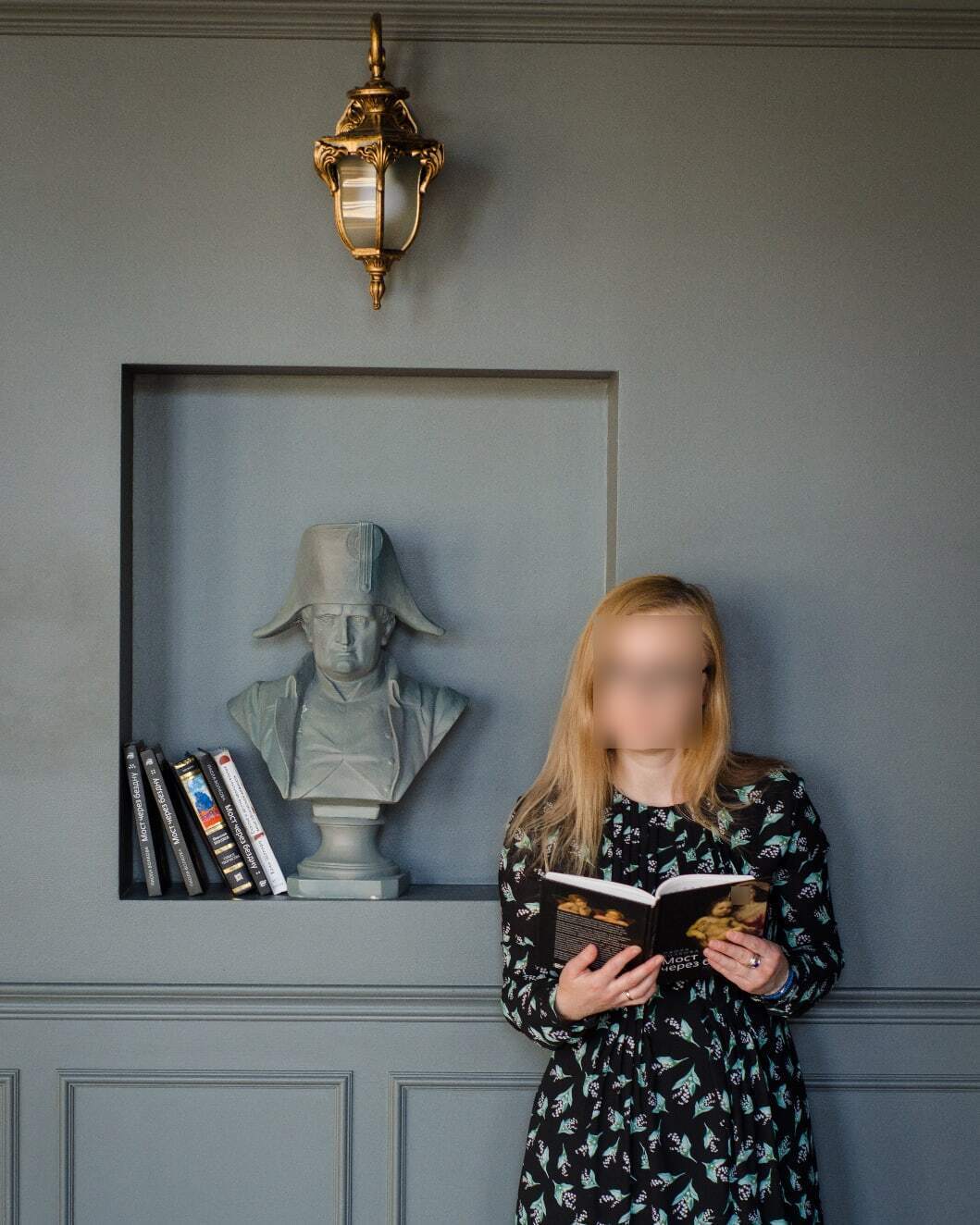 1) на полке стояло 6-7 книг похожих на ту что у девушки в руках все связаны тематикой с историей..