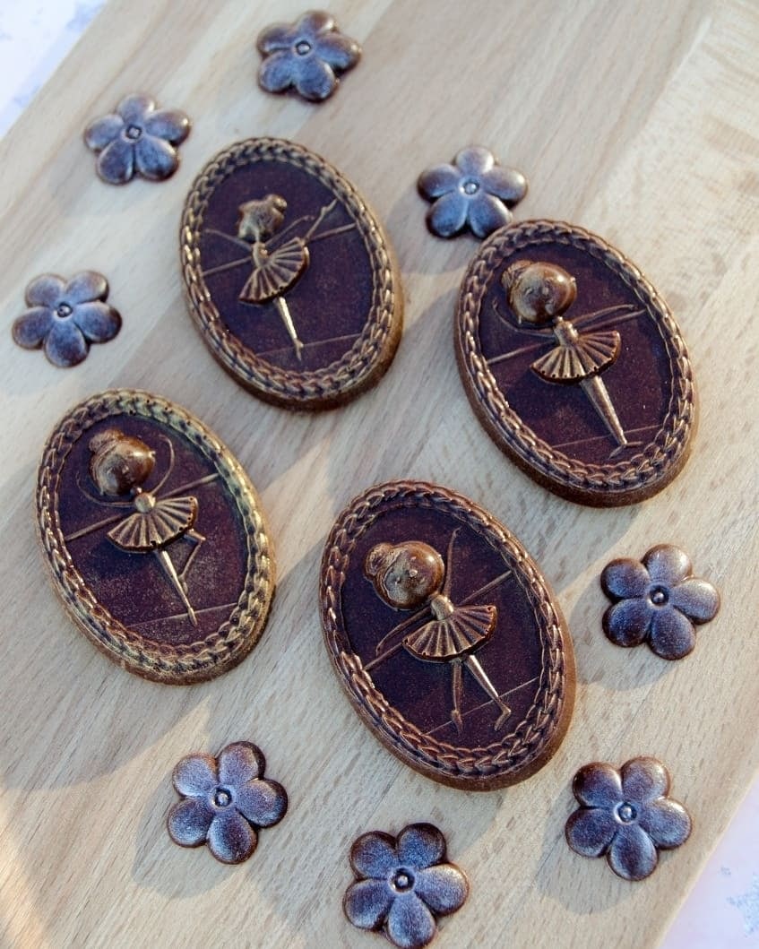 Эти шоколадки ручной работы. Балерина на шоколадке держала пятки вместе на самой правой шоколадке.