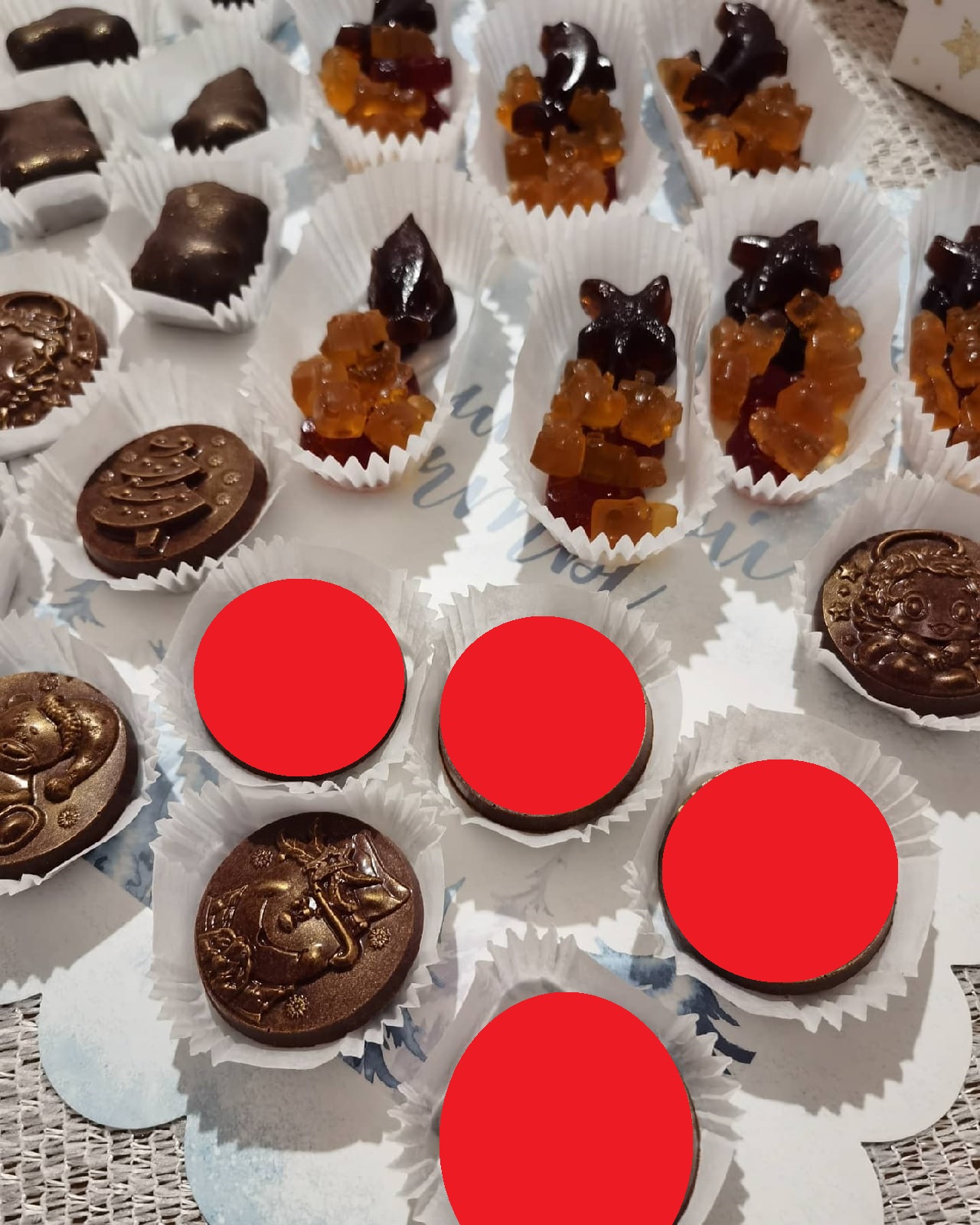 На круглых закрашенных красным шоколадках что-то изображено.