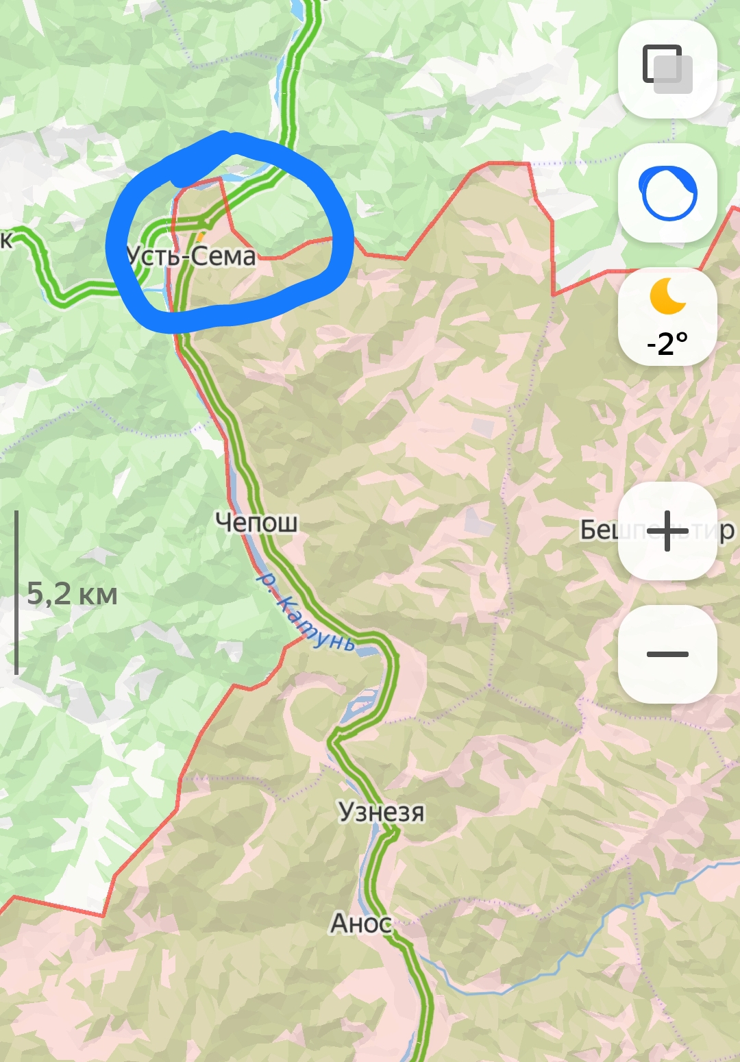 Я выехала из с Усть-Сема по направлению к мосту, а затем, переехав мост, с моста ушла влево, далее я ехала по основной трассе в сторону с.Черга.