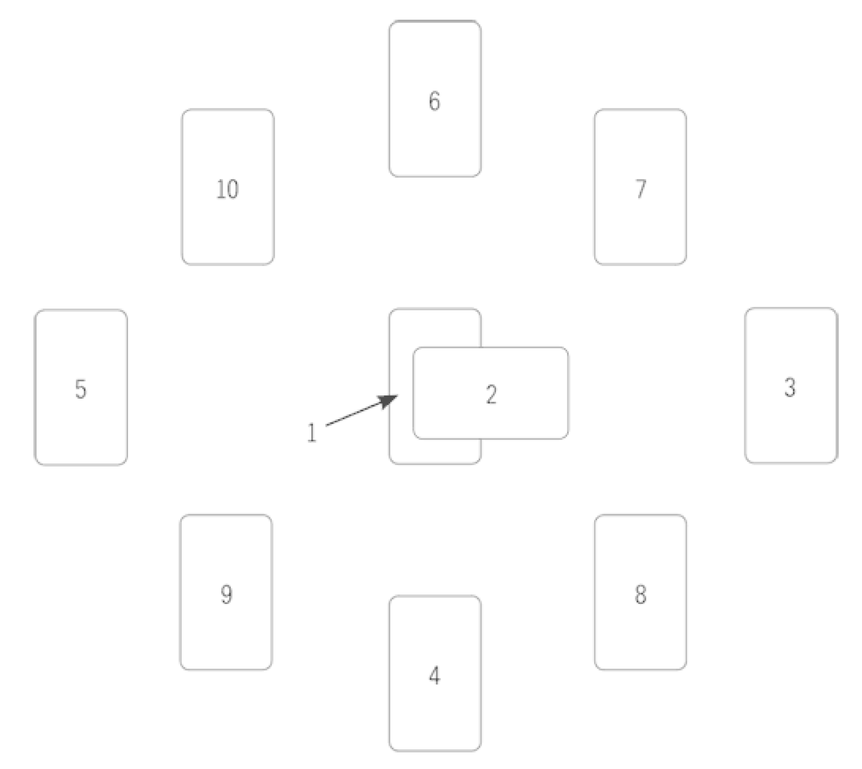 Итак, сосредоточьтесь мысленно на вашей будущей жизни — поскольку мы воспринимаем ее именно следующей за этой, — мешая и снимая колоду. Попытайтесь не сгроить никаких догадок относительно будущего, раскладывая карты согласно рис. чтобы ваши ожидания не затуманили и не изменили расклад.