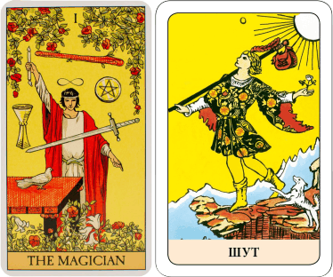 Антитезис. Шут несет свои магические инструменты в сумке, они скрыты от постороннего взгляда, также как и магическая сущность скрыта под его шутовским обликом. Шут одет в пестрое одеяние бродячего артиста, красный цвет активности спрятан на подкладке. Перед шутом раскинулась бездна, но она его не пугает. Казалось бы, шут бездеятелен и безрассуден: поза неустойчивая, взгляд устремлен в небеса, он не замечает опасности. Однако в его внутреннем мире творится работа – он интраверт. Пройдя множество испытаний и дальних земель, шут сумел пронести с собой белую лилию – символ чистоты и непорочности. Шут сознательно ищет опору в бессознательном (божественном, интуитивном).