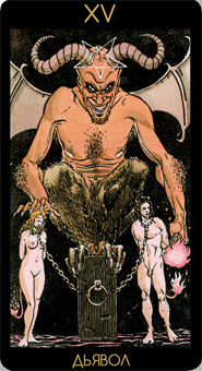 Дьявол связан прежде всего со страхами, ложью и невежеством, результатом которых являются сомнения и пессимизм. Само слово "дьявол" произошло от корня со значением "соперник, противник" - то есть кто-то или что-то, действующее против ваших интересов и благополучия. Карта показывает то, что блокирует, ограничивает или ослабляет вашу творческую энергию, что не дает вам действовать и что, возможно, как-то связано с детскими травмами и чувством вины. В лучшем случае вы будете делать то, что плохо для вас, насмехаться над другими, приставать к ним, мучить и сбивать их с толку. Вы можете нарушать социальные или сексуальные табу, с головой уходить в материальные потребности или испытывать соблазн "прогнуть" под себя общепринятые правила и заставить их служить вашим целям. Вы можете искать доходов, недолжным образом используя силу и влияние, а также навязывать другим людям свою волю или стремиться обрести контроль над ними. С другой стороны, вами может овладеть страх, что некие злые внешние силы хотят причинить вам вред, и тогда вы приметесь срывать свою паранойю на окружающих, мучая их своей подозрительностью и ненавистью. Подо всем этим, однако же, будет скрываться неспособность любить и, как следствие, ощущение изоляции и отсутствия контакта с людьми.