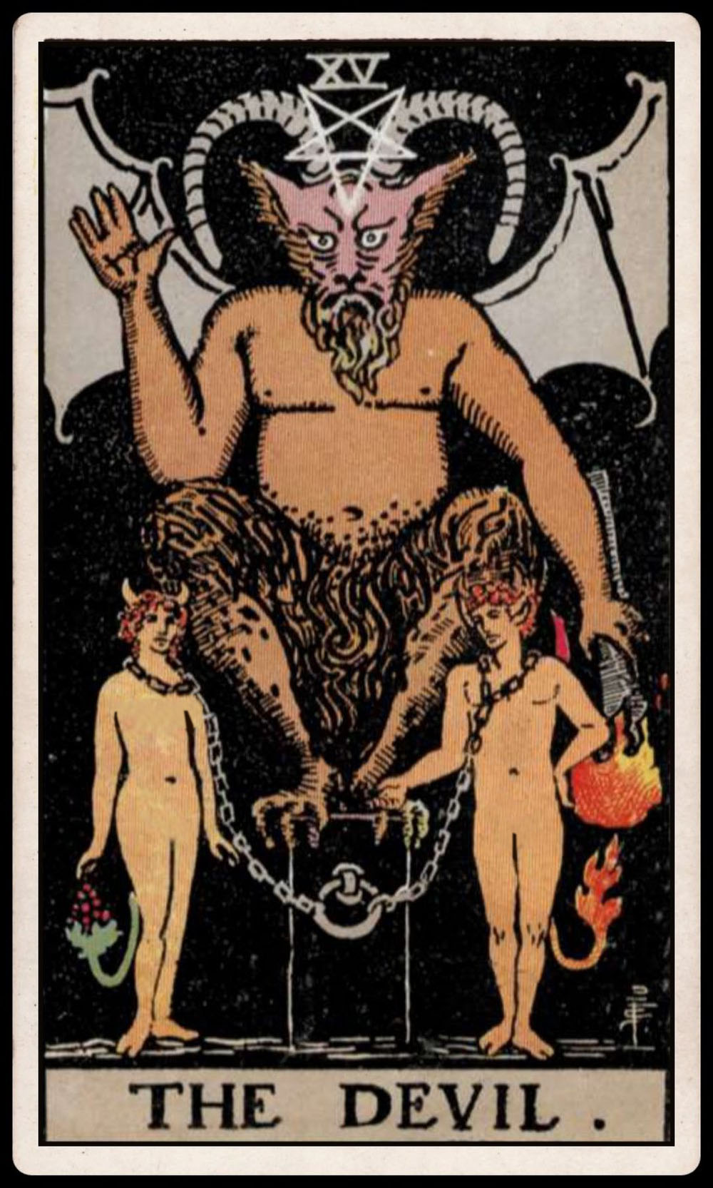 С психологической точки зрения эта карта олицетворяет Тень - те аспекты вашей личности, которые вы отрицаете, отказываетесь осознавать или прячете. Она может представлять сексуальность, но сексуальность, связанную с извращениями и насилием. Вас могут искушать похоть, алчность или гордыня. Вы можете оказаться одержимым каким-нибудь человеком или объектом и испытывать фатальное влечение к нему. В эмоциональном плане это может быть паника или смятение. Быть может, вы сами пробудили все силы ада или оказались источником хаоса. Иногда при этом Дьявол означает всего лишь веселье, шаловливость и разные розыгрыши - "сам черт меня заставил это сделать". А может быть, вы боитесь и тщательно избегаете того, что считаете "плохим", а это само по себе уже ограничивает и стесняет ваши действия. Иногда Дьявол означает намеренное и злостное причинение боли другим или склонность действовать из ревности, зависти или враждебности. Это может также быть зависимое поведение или компульсивные поступки и реакции. В качестве бога Пана Дьявол внушает трепет и влечет человека к стихийным силам природы. Он может означать еще и отсутствие чувства юмора и неспособность посмеяться над собой, а также избыточный догматизм и поверхностное восприятие.