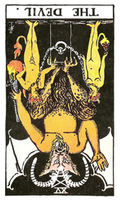 Вы можете решительно отвергнуть все соблазны, сорвать с глаз повязку и ускользнуть из неприятной ситуации. Возможно, настало время бросить разрушительную для вас работу, на которой вы чувствуете себя собственностью компании, но с которой боитесь расстаться из-за необходимости оплачивать счета. Перевернутый Дьявол может также указывать на возможность получить доступ к доселе сокрытым сокровищам творчества и способности спонтанно наслаждаться жизнью. Если вы сможете осознать, что ваши страхи беспочвенны, то освободитесь от ложных запретов и манипулятивных сценариев, а также от различного рода созависимостей. Часто эта карта дает возможность увидеть свои разрушительные поведенческие модели и причины неправильного использования энергетических ресурсов. Иногда она проявляется в том, что слабости и порочные действия того или иного публичного лица развеивают ваши иллюзии. А иногда - в вашей склонности придумывать причины и извинения, лишь бы только не видеть, насколько плоха на самом деле ситуация.