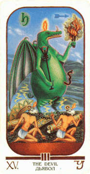 Тифон изображен как крылатое создание, составленное из борова, человека, летучей мыши, крокодила и гиппопотама - странный конгломерат различных частей человека и животных подобно Сфинксу. Он держит в руке огонь раздора. Тифон создан собственными неправедными деяниями человека, которые, обращаясь на их творца, разрушают его. Крылья летучей мыши раскрывают Тифона как порождение абсолютного мрака, тьмы. Он является разновидностью черного ангела. Хотя пламя знания горит над его головой, тьма есть также часть божественной природы. Его крокодилья голова, козлиные копыта, раздутое тело бегемота и черная змея чувственности, извивающаяся из его пупка, демонстрируют его взаимоотношения с материальной природой. Он также сочетает атрибуты обоих полов. Своим Скипетром Разрушения он вдребезги разбил стены храма вокруг себя. Свет его факела мрачен, заволочен дымом. В левом верхнем углу карты виден астрологический символ Сатурна -символ стагнации, жестких рамок и правил. Два человека, прикованные друг к другу, стоят на коленях среди руин. Их бараньи головы символизируют энергию солнца, которая означает, что энергия их освобождения находится в них самих. Тифон, подобно европейскому Дьяволу, олицетворяет силу, временно служащую заблуждению. Он - зло, которое придумали люди, чтобы оправдать себя и найти причину для всего дурного, что творят они сами. Этот Аркан представляет темную сторону всех вещей и явлений. В тени света скрывается Тифон (или средневековый Дьявол). Не ходить в тень - трусость; человек должен уметь видеть свою темную сторону и не бояться вступить с ней в борьбу или в диалог. Это воистину "та сила, что вечно хочет зла, и вечно совершает благо". Зло, как его ни называй, существует, и рождается оно не где-то далеко, а в нас самих. Зачастую так трудно поверить, что этот Аркан порою отражает наше лицо. Но посмотрите в зеркало без страха. Вы увидите жажду власти, тщеславие, алчность, зависть - все низменные чувства, которые создают рабство для свободной и бессмертной Души.