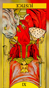 При виде перевернутого Правосудия люди часто говорят о нечестности и неискренности. Это страх перед тем, что правосудие будет уничтожено, порядок - ниспровергнут, а планы и желания не сбудутся. Возможны сложности с законом или полное его игнорирование в той или иной ситуации. Возникает необходимость привнести равновесие в жизнь и отношения. Обратите внимание на карты по обе стороны от перевернутого Правосудия, чтобы понять, что именно нуждается в уравновешивании. Возможно, вы боитесь, что вас заставят отвечать за свои действия, призовут к отчету или принудят исправить причиненный вред и возместить убытки. Вы можете чувствовать стыд или унижение, можете оказаться неспособным самостоятельно справиться с последствиями своих поступков. Перевернутое Правосудие может также означать справедливость в литературном смысле этого слова, когда герой произведения добивается того, что ему причитается, необычными или же весьма сомнительными средствами. Говоря о литературе, карта может также означать так называемый "кризис жанра" или усталость от бумажной работы.