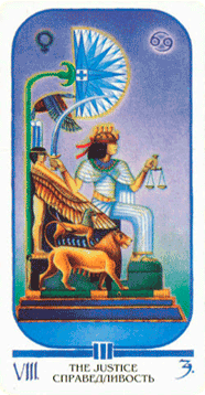 Карта выполнена на светло-фиолетовом фоне, который внизу через зеленый переходит в глубокий голубой. Фиолетовый «цвет в египетской символике является цветом Воина и указывает на решительные действия, продиктованные альтруистическими мотивами. В левом верхнем углу виден знак Венеры, а в правом верхнем - знак зодиакального Рака. Женская фигура является олицетворением Справедливости. Она сидит на троне, стоящем на верхушке трех ступеней, которые представляют три мира, поскольку Справедливость может вершиться, только затрагивая все три плана. На Справедливости надета корона, и в правой руке у нее меч, а в левой - весы Ее весы и меч символизируют взвешенность приговора и быстрое, решительное исполнение закона. Эта карта напоминает о суде над душами в зале Осириса. Она учит, что только сбалансированные силы могут продолжать существование и что вечная справедливость мечом уничтожит то, что не сбалансировано. Справедливость вершит свой суд с завязанными глазами, потому что видимое не должно влиять на ее решение. У Правосудия завязаны глаза, поэтому у нее нет предвзятости или предпочтений. Позади видны семь фигур: