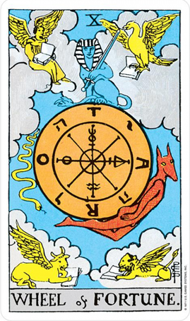 Колесо Фортуны символизирует перемены, движение, экспансию и возможности во всех сферах жизни. Часто эти перемены носят внезапный и вполне осязаемый характер, иногда - радостный, но их результаты бывает весьма трудно предсказать. При благосклонном участии богини Фортуны - она же Госпожа Удача - ситуация может повернуться к лучшему. С метафизической точки зрения это воспринимается скорее как судьба и синхронистичность, нежели как шанс и совпадение. Подобно тому как Судьба есть дочь Необходимости, вы меняетесь в соответствии с требованиями текущей ситуации. Перед вами могут открываться заманчивые перспективы, но вступать ли в игру - зависит только от вас, ибо сказано, что "удача там, где подготовка идет рука об руку с возможностью". Эта карта может означать появление новых ресурсов, людей, денег, известий и так далее, равно как, впрочем, и исчезновение всего этого. Возможно, вы работаете с возобновляющимися циклами событий или переменными моделями - это может быть бизнес, годовщины или праздники солнечного календаря. Быть может, вы стремитесь обрести объемное видение целого, что позволило бы вам взглянуть на ситуацию с высоты птичьего полета, а возможно, всего лишь отправляетесь на прогулку. Или же непостоянство и легкость стали характерной чертой вашего мировосприятия - "сегодня пришло, завтра ушло".