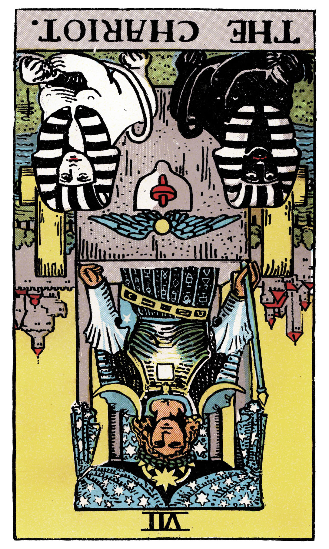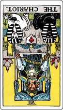 Перевернутая Колесница иллюстрирует историю Эдипа, который, встретив на перекрестке старца на колеснице, убивает его. Затем Сфинкс загадывает ему загадку, Эдип правильно на нее отвечает, тем самым спасая страну, и женится на ее царице. Впоследствии выясняется, что старец тот был его отцом, а царица - матерью. Именно от этой легенды ведет свое происхождение фрейдовский "эдипов комплекс". Возможно, вы в настоящий момент тоже находитесь на пути самопознания и стремитесь к победе, преодолевая все препятствия, но перевернутая Колесница спрашивает - какой ценой? Некоторые тарологи считают, что изображенный на карте победитель - подросток, только начинающий свой путь к мастерству и власти, а перевернутая карта таким образом показывает, что его ждет провал. Вы можете быть чересчур самоуверенны и поспешны в действиях. Эта карта может предсказывать автокатастрофу, проблемы на дороге или в путешествии. Может быть, поездка будет отложена или отменена. Сейчас очень легко сбиться с курса.