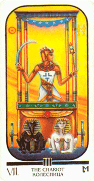 Ярко-желтый, теплый, солнечный фон карты представляют идею радости, духовной жизни и изобилия творческих сил. На карте изображен воин-победитель, увенчанный короной с уреусом и тремя звездами. Его белые одежды с золотым поясом говорят о чистоте помыслов и высоких идеалах. На его груди мы видим знак Тау и очертания правого и левого углов - символы защиты высших сил. Воин восседает на колеснице, запряженной черным и белым сфинксами. Белый и черный Сфинксы - противоборствующие силы света и тьмы - используются как движущие силы для продвижения боевой колесницы, знак того, что Воин способен приручить их для исполнения своих приказаний. Как Арджуна-победитель из Бхагават Гиты, он решительно правит свою кубическую повозку навстречу опасностям, не обращая внимание на препятствия. В руках у него нет поводьев, а только сабля в виде полумесяца (меч по беды) и магический жезл, представляющий единство трех начал. У воина нет "материальных" рычагов власти - он управляет ситуацией только усилием собственной воли, подобное положение требует находиться в постоянном напряжении. Воин управляет под усыпанным блестящими звездами синим балдахином, символом небесной жизни. Семь звезд представляют семь астрологических планет. Солнечная колесница с символом септенера раскрывает тайну семи планет, являющихся колесницами солнечной энергии Звездный навес колесницы поддерживается четырьмя столбами. Четыре столба, поддерживающих навес, символизируют четыре Могущества, на которых держится мир, представленный звездной занавесью. С другой стороны, четыре колонны, окружающие Воина, символизируют четыре составляющих его личности, которыми он овладел, научился управлять и преобразовал в колесницу, перевозящую его. Воин не стоит в колеснице, а поднимается из куба, символизируя восхождение от 4 к 3. Четырехугольный коричневый куб колесницы, украшенный цветочным орнаментом, представляет материальную вселенную, жизнь на земле. Жезл в руках Воина представляет его восхождение к 3 - скипетр является знаком превосходства над тремя сферами: физической, ментальной и духовной. Колесница украшена крылатым диском солнца, символом Амона-Ра, который покровительствует и помогает в пути.