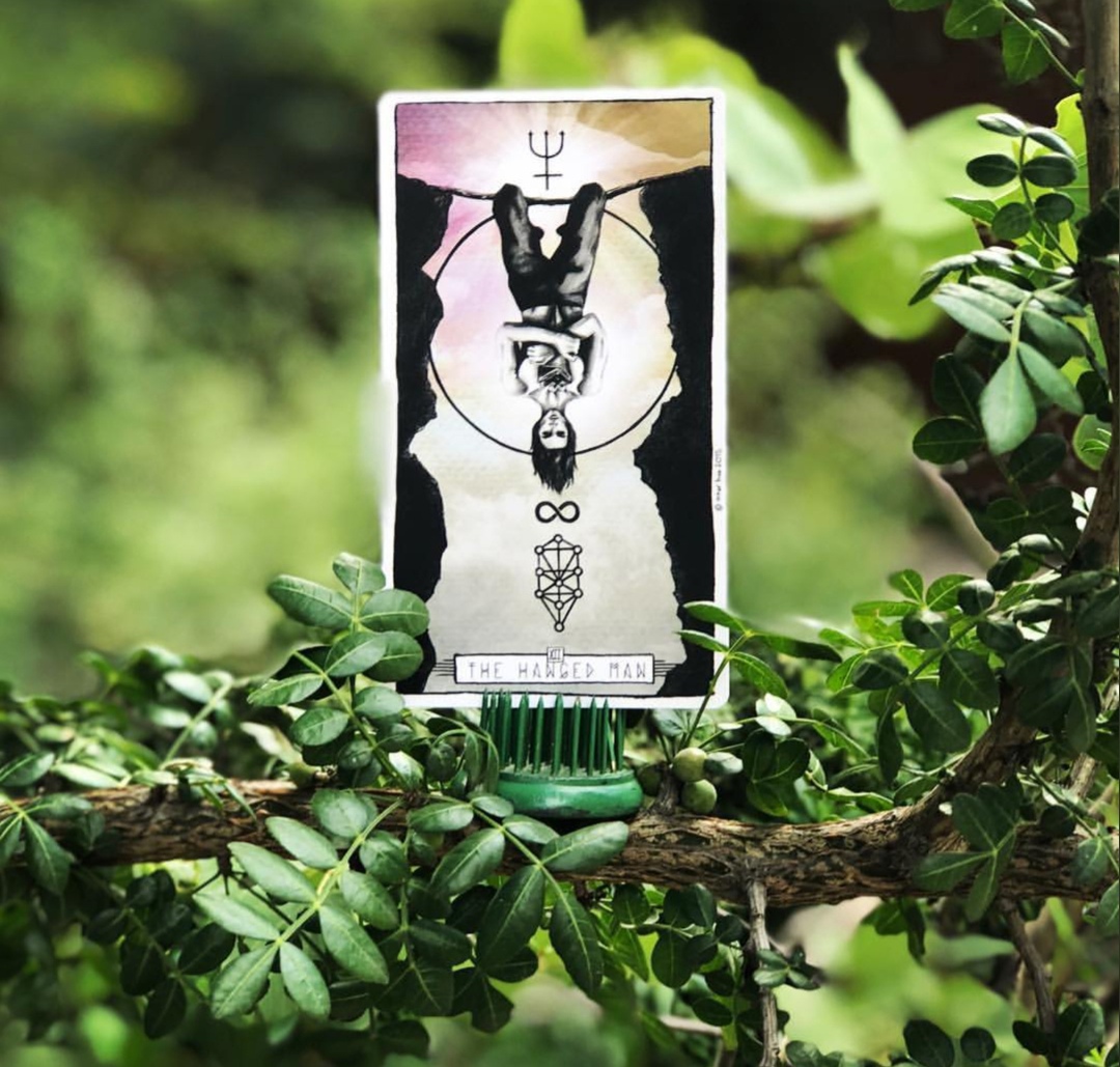Важный символ. Деревья - в принципе живые существа. Часть органического мира. Обладают осознанием. Но здесь между ними наказывают человека. Это говорит о том, что ответ в виде событий Повешенного приходит от живого, откликающегося Мироздания. Все мы связаны на тонком уровне и когда оступается один - мы все несем ха это ответственность и все чувствуем это на себе. Вот и деревья на карте не цветут, не радуются, они мертвы. Посмотрите - они сухие. Сучки обрублены и их ровно 12. Это - указание на 12 знаков зодиака. А в Таро полнота Вселенной части изображается через знаки зодиака. Такое вы можете увидеть еще на Императрице, у которой в голове корона из созвездий. В нашем мире Вслеенную, Мироздание привычно изображают символически через зодиак. Поэтому Повешенный - каким бы мелким он не был, влияет на глобальный путь человека, на его карму и отражается на судьбе в целом. Путь по чуть чуть, понемногу, но все же...