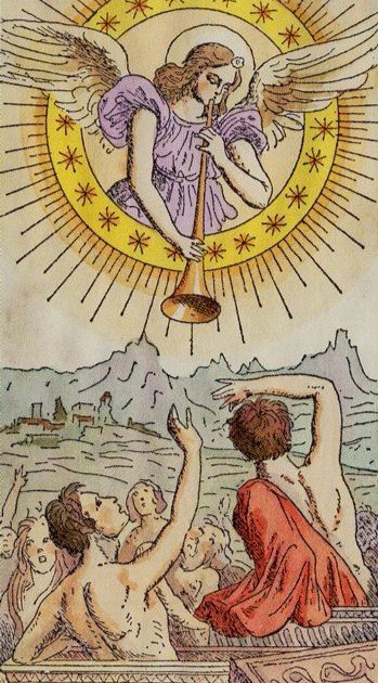 Небо в Таро - символ божественного, сил Бога, высших сил. Покровительство человеку, помощь или, наоборот - кара. В данном случае, Бог в лице Ангела радуется, приветствует человека, ликует. Это - символ поощрения, поддержки. Песня во славу выхода из тьмы на свет, во славу начала новой страницы в жизни, как начала новой жизни.