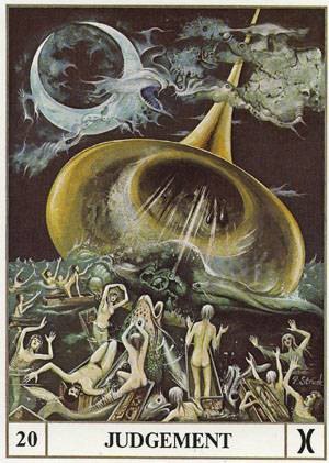 Могилы - знакомый нам символ четырехгранника. На Императоре, Императрице, Папессе и других арканах это был трон. На Колеснице - повозка. На Маге - стол. Тут - могилы. Это - символ материальной реальности, нашей с вами. И вот на Возрождении мы восстаем из нее, как бы отряхивая с себя то, что в материальности стало для нас тленом. Мы как бы вылезаем на свет из мрака умерших представлений, правил и обстановки. Нам становится легко и свободно. Это - важно осознать, и тогда отношение к Возрождению станет правильным.
