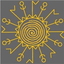 Spiral (раскручивается против часовой стрелки). В центре става один из сложных и мистических символов – спираль. Спираль – это символ жизненной силы и путешествия по жизни, символ цикличности времени и выхода на новый уровень сознания. Спираль, сочетающая в себе форму круга и импульс движения, также является символом Солнца