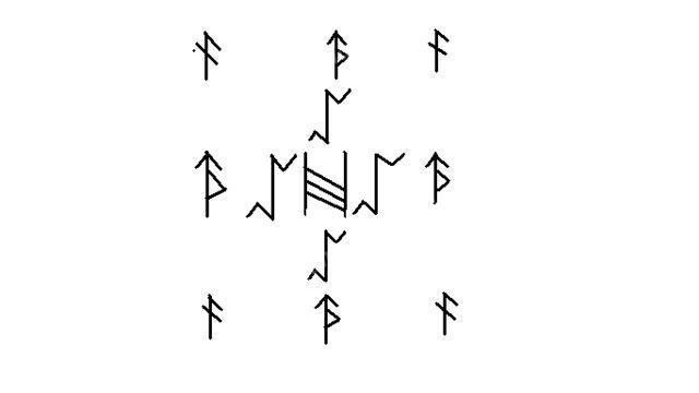 вязь 3 Хагала в кресте Квеортов потом опять в кресте вязь Тейваз+Турисаз и по углам вязь Лагуз+Наутиз.