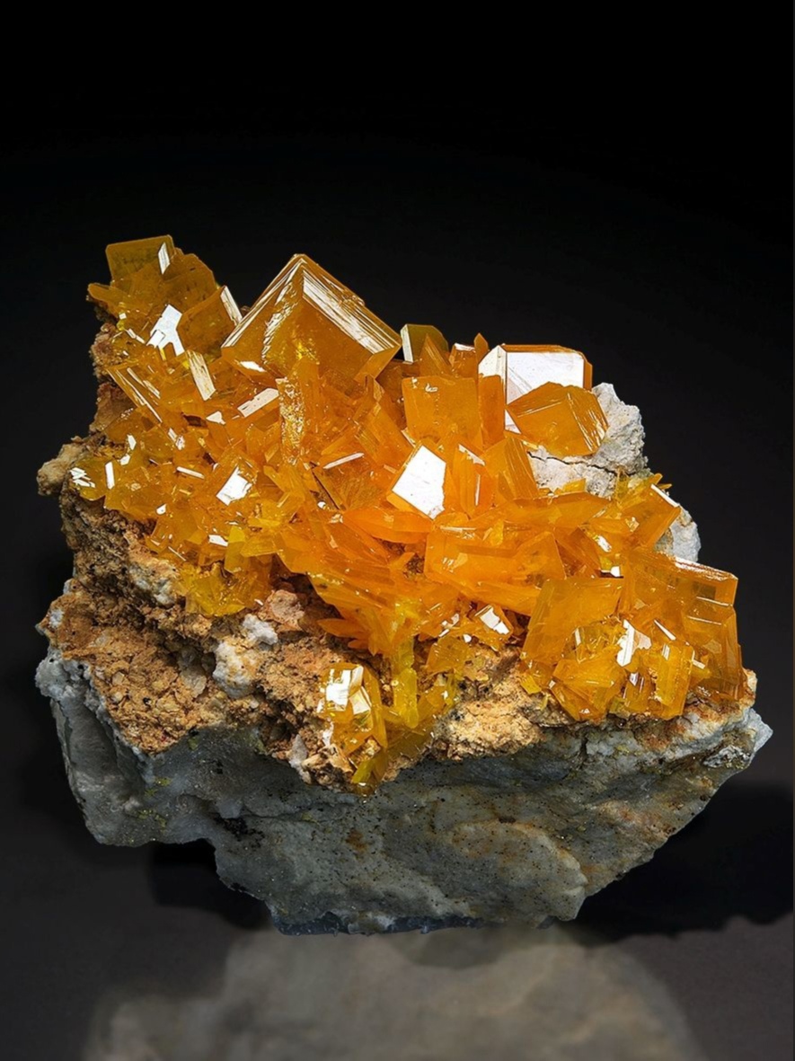 Вульфенит встречается в виде хорошо образованных кристаллов, обычно мелких, от оранжево до коричневого цвета, обладает сильным блеском.